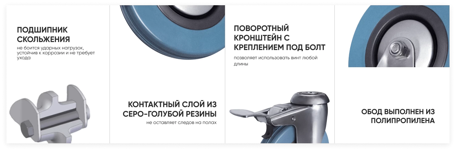 Аппаратное поворотное колесо SChgb 42 с полипропиленовым ободом и литой шинкой из термопластичной серой резины. Устойчиво к износу и не оставляет следов торможения на поверхности, бесшумное. Диаметр колеса 100 мм, ширина обода 27 мм. Подшипник скольжения в ступице обеспечивает лёгкий ход. Прочный кронштейн из стали с крепёжным отверстием «под болт» и тормозом. Грузоподъёмность 80 кг даёт возможность использовать их в медицинском оборудовании, мебели для больниц, тележках для сервиса, ином лёгком оборудовании.