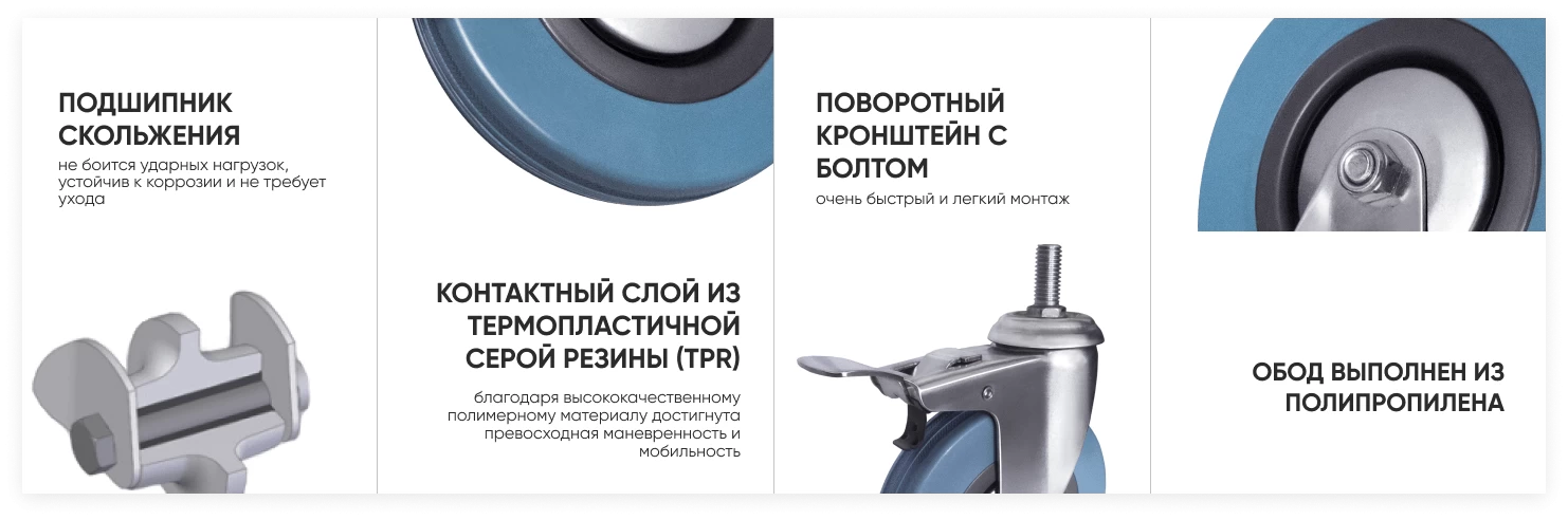 Аппаратное поворотное колесо SCtgb 42 с полипропиленовым ободом и литой шинкой из термопластичной серой резины. Устойчиво к износу и не оставляет следов торможения на поверхности, бесшумное. Диаметр колеса 100 мм, ширина обода 27 мм. Подшипник скольжения в ступице обеспечивает лёгкий ход. Прочный кронштейн из оцинкованной стали с болтовым крепёжным отверстием и тормозом. Грузоподъёмность 80 кг даёт возможность использовать их в медицинском оборудовании, мебели для больниц, тележках для сервиса, ином лёгком оборудовании.