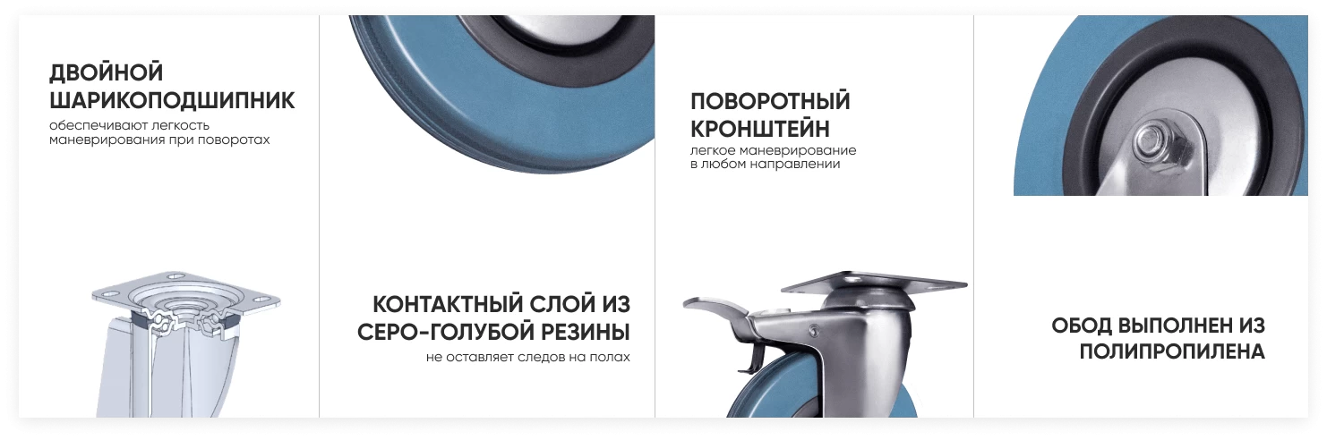 Аппаратное поворотное колесо с тормозом серии SCgb 42 с полипропиленовым ободом и литой шинкой из термопластичной серой резины. Устойчиво к износу и не оставляет следов торможения на поверхности, тихо катится по поверхности. Диаметр колеса 100 мм, ширина обода 27 мм. Подшипник скольжения в ступице обеспечивает лёгкий ход. В поворотном механизме установлен двухрядный поворотно-опорный подшипник. Прочный кронштейн из стали с платформенным типом крепления и тормозом. Грузоподъёмность 80 кг даёт возможность использовать их в медицинском оборудовании, мебели для больниц, тележках для сервиса, ином лёгком оборудовании.