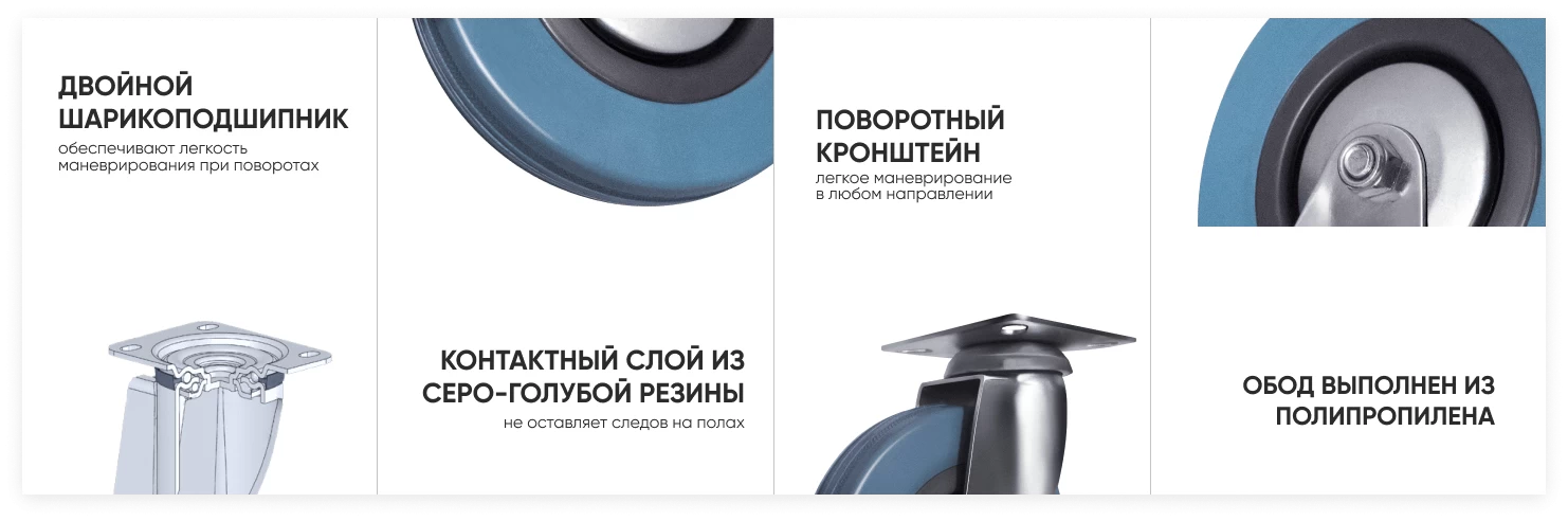 Аппаратное поворотное колесо SCg 42 с полипропиленовым ободом и литой шинкой из термопластичной серой резины. Устойчиво к износу и не оставляет следов торможения на поверхности, тихо катится по поверхности. Диаметр колеса 100 мм, ширина обода 27 мм. Подшипник скольжения в ступице обеспечивает лёгкий ход. В поворотном механизме установлен двухрядный поворотно-опорный подшипник. Прочный кронштейн из стали. Грузоподъёмность 80 кг даёт возможность использовать их в медицинском оборудовании, мебели для больниц, тележках для сервиса, ином лёгком оборудовании.