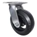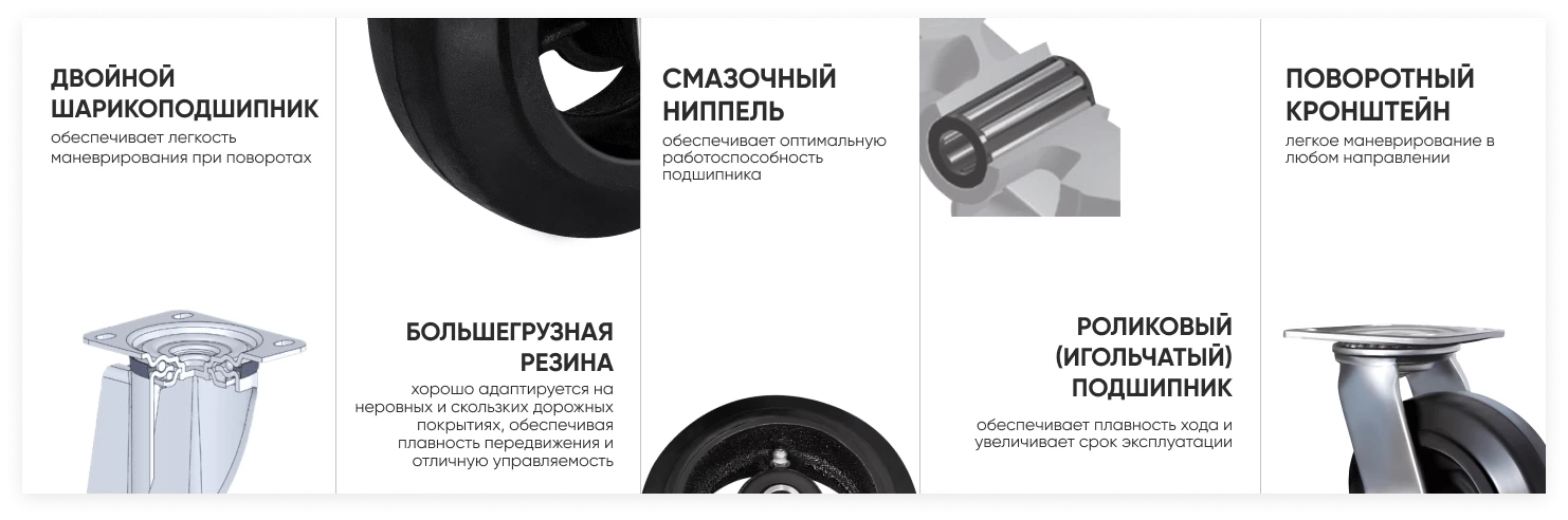 Большегрузное обрезиненное поворотное колесо SСd 42 с цельнолитым чугунным ободом и шинкой из жёсткой литой резины. Устойчиво к износу и имеет низкую остаточную деформацию. Диаметр колеса 100 мм, ширина обода 50 мм. Роликовый подшипник в ступице обеспечивает лёгкий ход. Усиленный поворотный кронштейн из оцинкованного металла. Двухрядный опорно-поворотный подшипник в поворотном механизме. Тип крепления – площадка. Грузоподъёмность 130 кг даёт возможность эксплуатации в большегрузных промышленных тележках, тяжёлом складском и промышленном оборудовании.