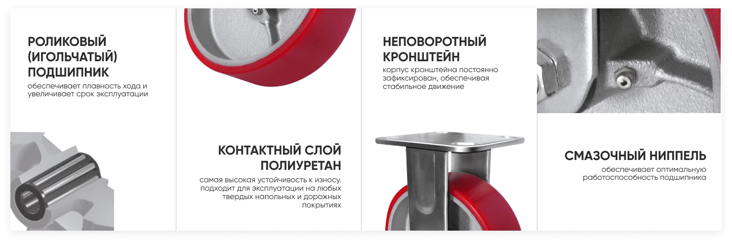 Полиуретановое неповоротное колесо FCp 80 с литым чугунным ободом и полиуретановой шинкой, устойчивой к износу и не оставляющей следов на поверхности. Диаметр колеса 200 мм, обод шириной 50 мм. Роликовый подшипник в ступице обеспечивает лёгкий ход. Усиленный неповоротный кронштейн из металла, устойчивого к коррозии. Грузоподъёмность 460 кг даёт возможность эксплуатации в большегрузных промышленных тележках, тяжёлом складском и промышленном оборудовании.