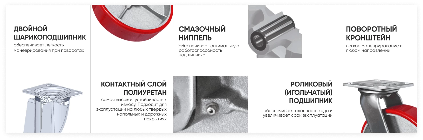 Полиуретановое поворотное колесо SCp 63 с литым чугунным ободом и полиуретановой шинкой, устойчивой к износу и не оставляющей следов. Диаметр колеса 150 мм, ширина обода 50 мм. Роликовый подшипник в ступице обеспечивает лёгкий ход. Усиленный поворотный кронштейн из металла, устойчивого к коррозии. В поворотном узле двухрядный поворотно-опорный подшипник, обеспечивающий лёгкое вращение. Грузоподъёмность 360 кг даёт возможность эксплуатации в большегрузных промышленных тележках, тяжёлом складском и промышленном оборудовании.