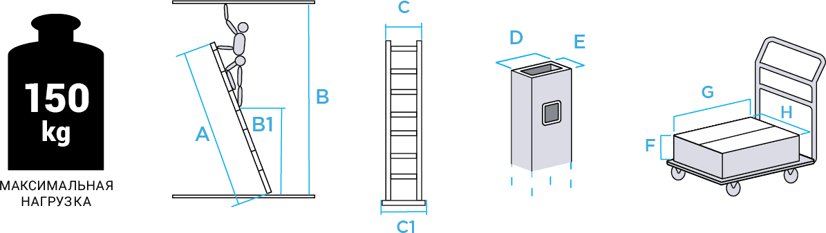 | Артикул | Ступени | А, м | B, м | В1, м | C, м | C1, м | D, мм | E, мм | F, м | G, м | H, м | Объём, м3 | Вес, кг |