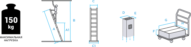 Артикул Ступени A, м A1, м B, м C, м C1, м D, мм E, мм F, м G, м H, м Вес, кг