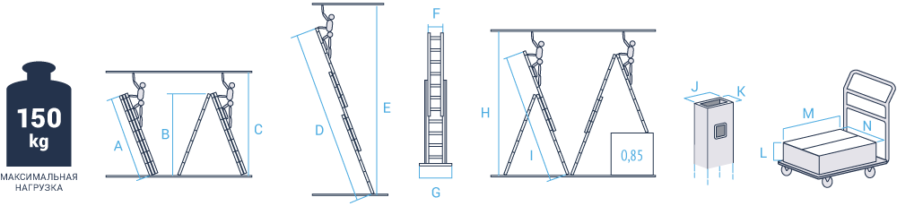 | Артикул | Ступени | A, м | B, м | C, м | D, м | E, м | F, м | G, м | H, м | I, м | J, мм | K, мм | L, м | M, м | N, м | Вес, кг |