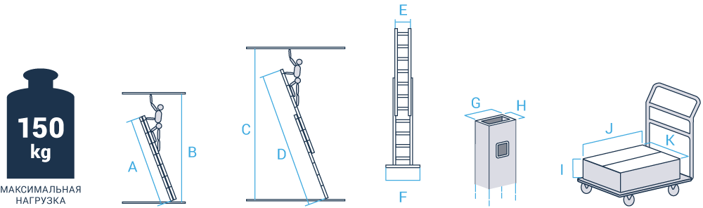 Артикул Ступени A, м B, м C, м D, м E, м F, м G, мм H, мм I, м J, м K, м Вес, кг