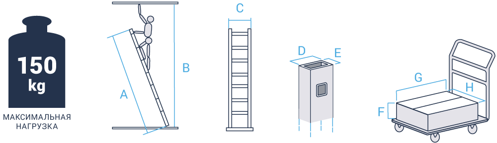 Артикул Ступени A, м B, м C, м D, мм E, мм F, м G, м H, м Вес, кг