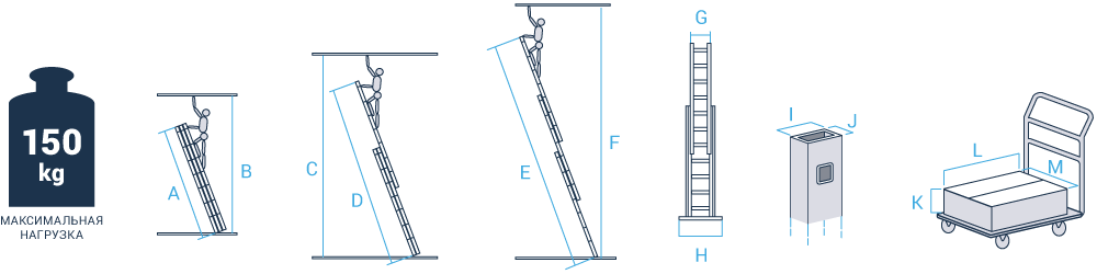 | Артикул | Ступени | A, м | B, м | C, м | D, м | E, м | F, м | G, м | H, м | I, мм | J, мм | K, м | L, м | M, м | Вес, кг | |