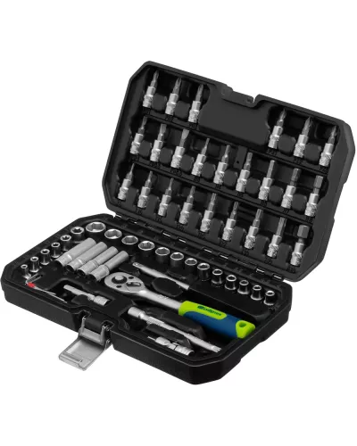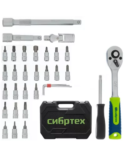 Набор инструментов Сибртех 13399, поставляющийся в пластиковом кейсе, состоит из 56 предметов с присоединительным размером 1/4"", предназначенных для закручивания и откручивания резьбового крепежа. В комплект поставки входят 2 удлинителя и кардан, облегчающие работу в труднодоступных местах. Набор будет полезен для ремонта автомобиля в гараже, пригодится также и в быту.
