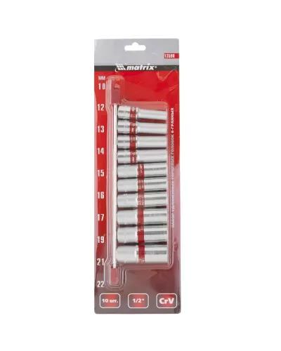 Набор удлиненных торцевых головок 1/2 дюйма Matrix 13590 включает в себя 10 шестигранных насадок 10-22 мм для работы с резьбовыми соединениями. Торцевые головки с увеличенной длиной применяются для закручивания и откручивания крепежей в труднодоступных местах, а также для извлечения свечей зажигания. Набор востребован у автослесарей, сантехников, а также будет полезен в бытовой сфере.