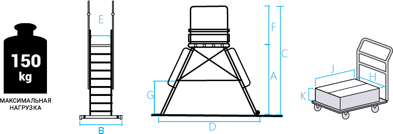 Артикул Ступени А, м B, м C, м D, м E, м F, м G, м Площадка, мм H, м J, м K, м Масса, кг