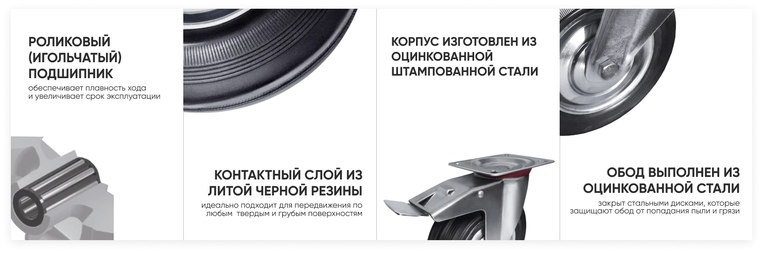 Колесо серии SCb 93 со стальным оцинкованным ободом и литой резиновой шинкой. Колесо имеет Ø 75 мм, ширина обода 22 мм, с роликовым подшипником. Кронштейн с крепёжной площадкой выполнен из оцинкованной стали. На кронштейн крепится металлический тормоз. В поворотном узле двухрядный шариковый подшипник, защищённый пластиковым пыльником. Грузоподъёмность 50 кг достаточна для эксплуатации в платформенных тележках, строительных лесах, вышках-турах, контейнерах ТБО.