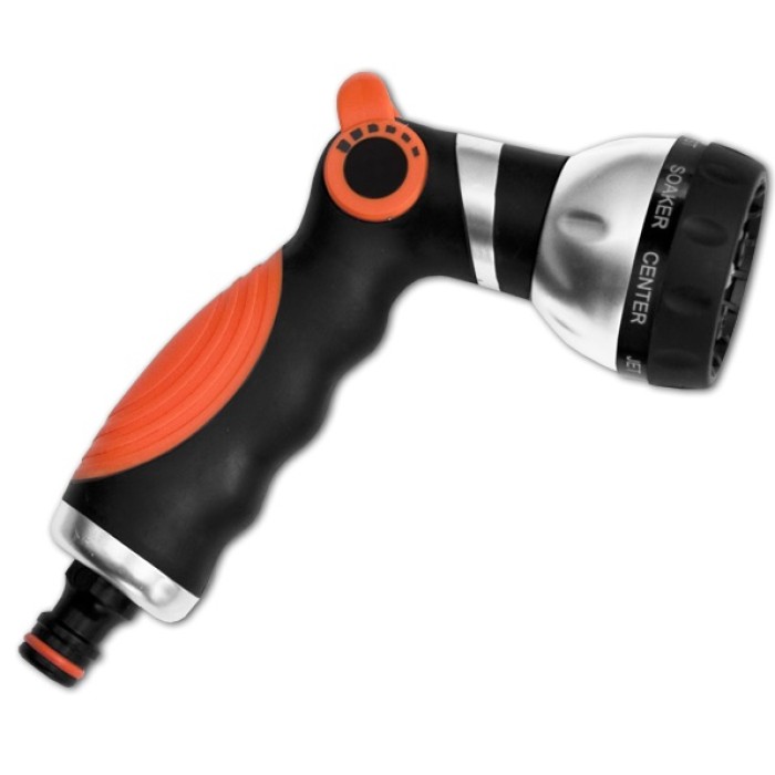 Эргономичный поливочный пистолет с основой из металла и обрезиненной ручкой. 8 возможных форм потока: от узкой струи до мелкого тумана. Регулятор подачи воды под большой палец с плавным перемещением.