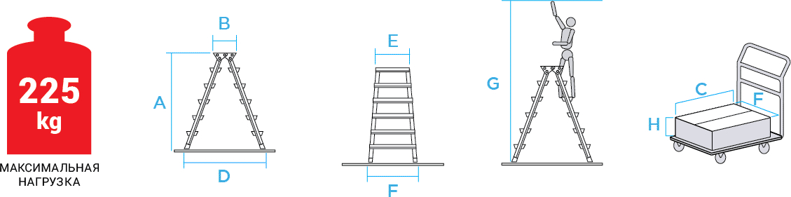 | Артикул | Ступени | A, м | B, м | C, м | D, м | E, м | F, м | G, м | H, м | M, кг | Вес, кг |