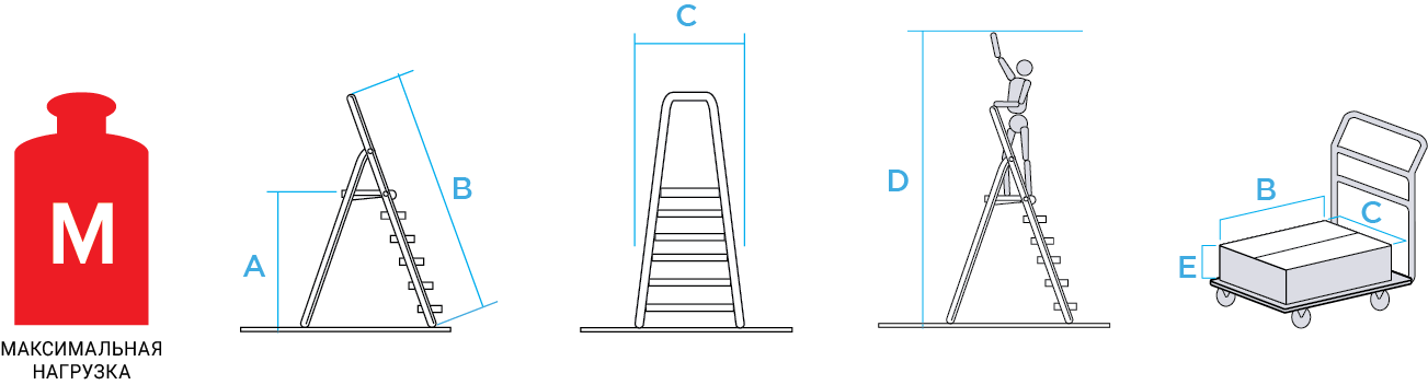 | Артикул | Ступени | A, м | B, м | C, м | D, м | E, м | M, кг | Вес, кг |