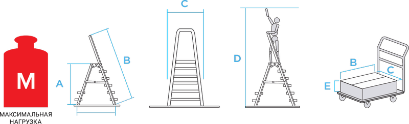 | Артикул | Ступени | A, м | B, м | C, м | D, м | E, м | F, м | M, кг | Вес, кг |