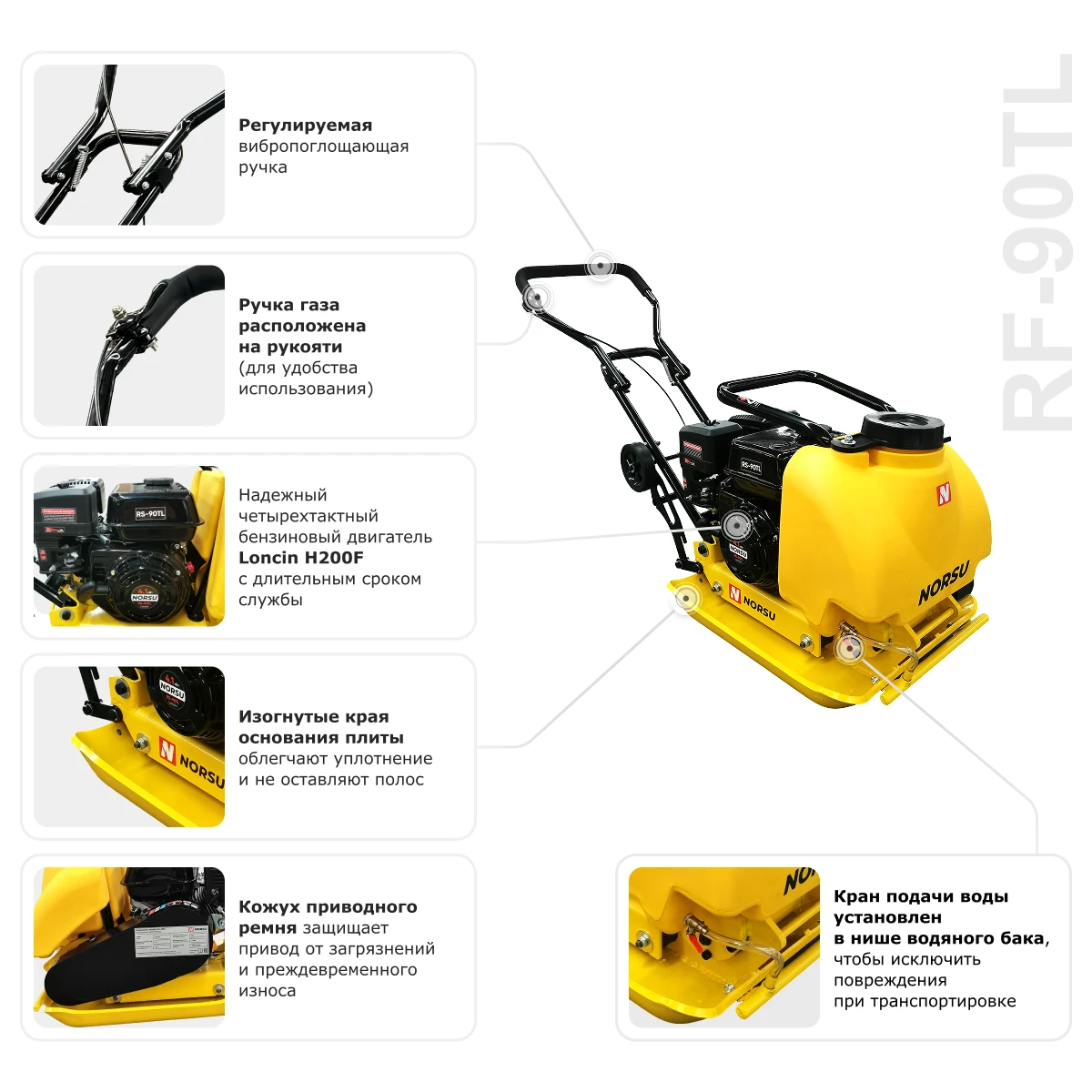 Основные характеристики Виброплита NORSU RF-90TL (колесный комплект, бак для воды)